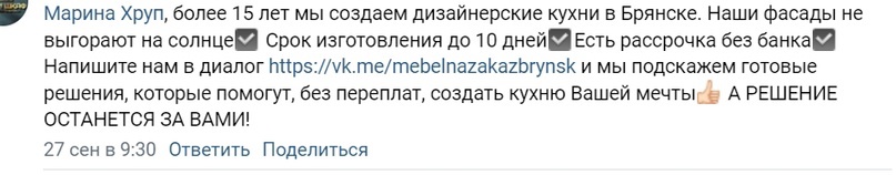 Продвижение во Вконтакте на изготовление кухонь на заказ в Милославском
